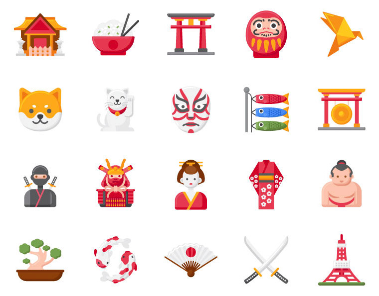 A comprehensive exploration of Japanese cultural motifs presented in two unique iconographic styles. One set utilizes a sleek, linear design with a dual-tone gradient, providing a contemporary feel. The other employs a bold, flat design with a rich color palette, ideal for a friendly and approachable aesthetic. Both sets aim to capture the essence of Japan, from its iconic landmarks and culinary delights to traditional arts and beloved symbols.