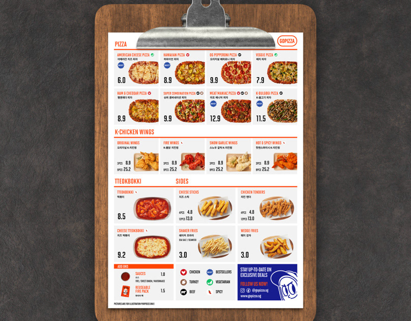 Gopizza Singapore aims to develop a restaurant menu featuring a simple and clean layout capable of accommodating a diverse range of pizza offerings.